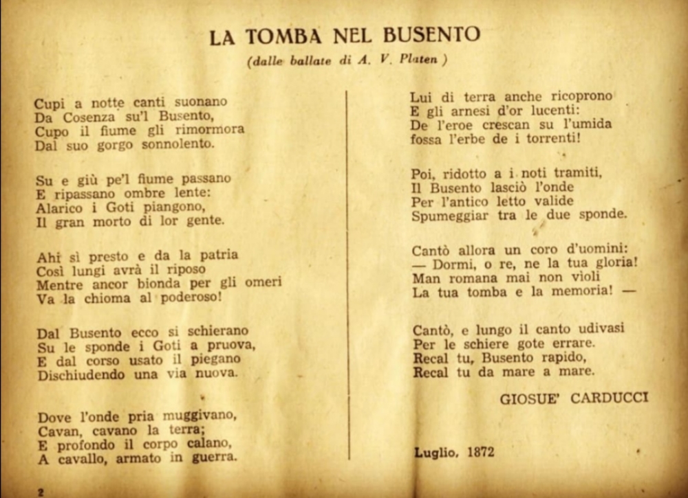 Come sappiamo, Alarico, il condottiero dei Goti, fu l’autore del celebre Sacco di Roma (410 d.C). Successivamente si diresse col suo esercito verso Sud, deciso ad arrivare in Africa. Sventura volle che quando Alarico giunse all’altezza di Cosenza, fu colpito dall’epidemia di malaria, che ne provocó la sua improvvisa morte. Per rendergli onore, il suo esercito costrinse gli schiavi (reduci del Sacco di Roma) a deviare il corso del Fiume Busento per realizzare un sepolcro inaccessibile e soprattutto introvabile. Fu così che una volta seppellito il re assieme al suo importante tesoro, e dopo aver ristabilito il corso del fiume, per accertarsi dell’introvabilitá della tomba,l’esercito decise di trucidare tutti gli schiavi. Fu cosi che da allora il tesoro non venne mai trovato,e a Cosenza è sempre più accreditata l’ipotesi di dove possa trovarsi la Tomba del valoroso re, ovvero tra le acque del fiume Busento.