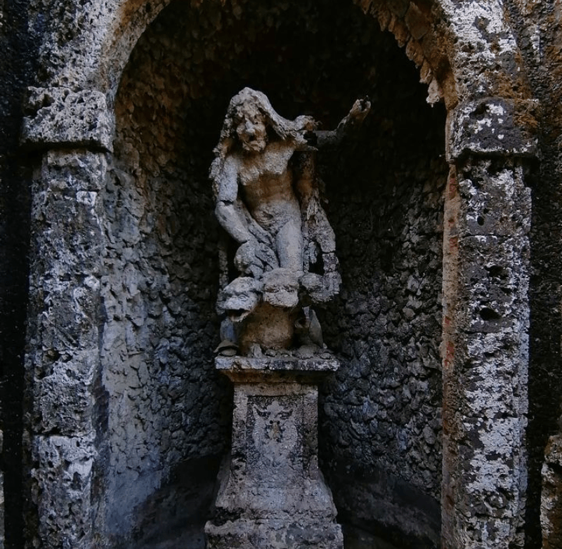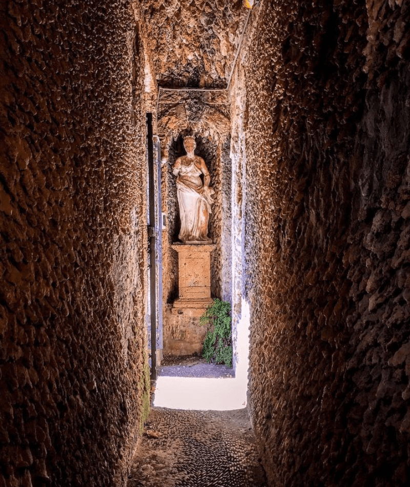 Passiamo al parco: si tratta di un giardino alla francese di epoca ottocentesca , che presenta una fila di cipressi, aiuole fiorite,un orto ma soprattutto un giardino segreto e una peschiera con zampilli d’acqua. Il punto cardine del parco è però il “Ninfeo dei venti” una sorta di percorso monumentale (che si conclude con la statua di Flora), caratterizzato da un tunnel ,due grotte con statue all’interno, e dai policromi colorati sormontati da una cupola decorata che ne fanno da cornice. Sul retro della villa un tempo sorgeva una galleria alberata di fontane e statue in nicchie purtroppo ora decisamente in rovina, eccetto la statua di Saturno.